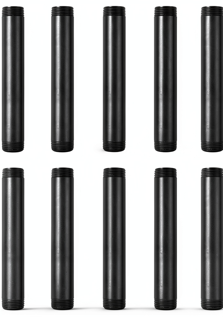 Niubid 3/4 inch black malleable iron pipe nipples are designed for durability and versatility in DIY projects. This 10-pack includes nipples threaded on both ends with NPT threads, made from rugged alloy steel and iron with a black exterior finish. Each nipple measures 3/4 inch in diameter with various lengths available, such as 6 inches, to suit different build needs. The protective coating ensures long-lasting performance, making these nipples ideal for industrial-style decor and functional setups.